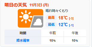 日中に雨の心配はなさそうです。気温は前日2日(土)よりは2度程低めの最高気温18度。