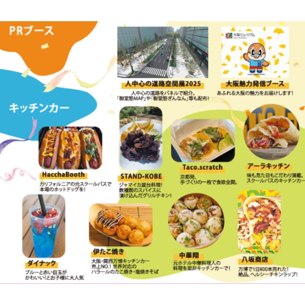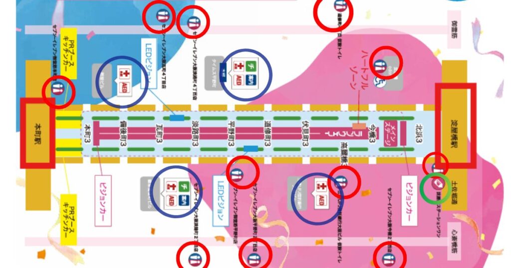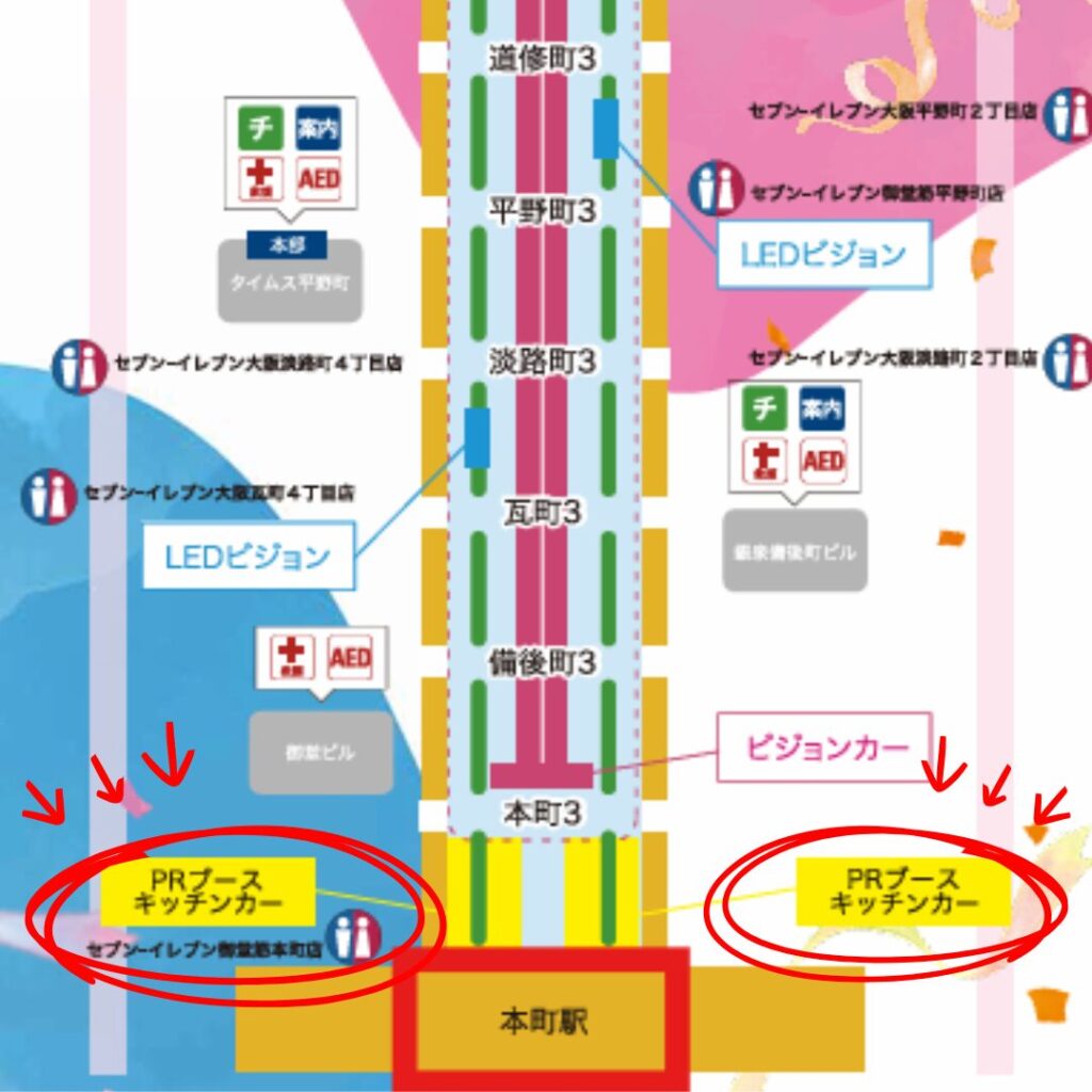 - キッチンカーなどのブースエリアは「本町3~船場中央3交差点」側に設置されており、観覧前後の利用がおすすめ。