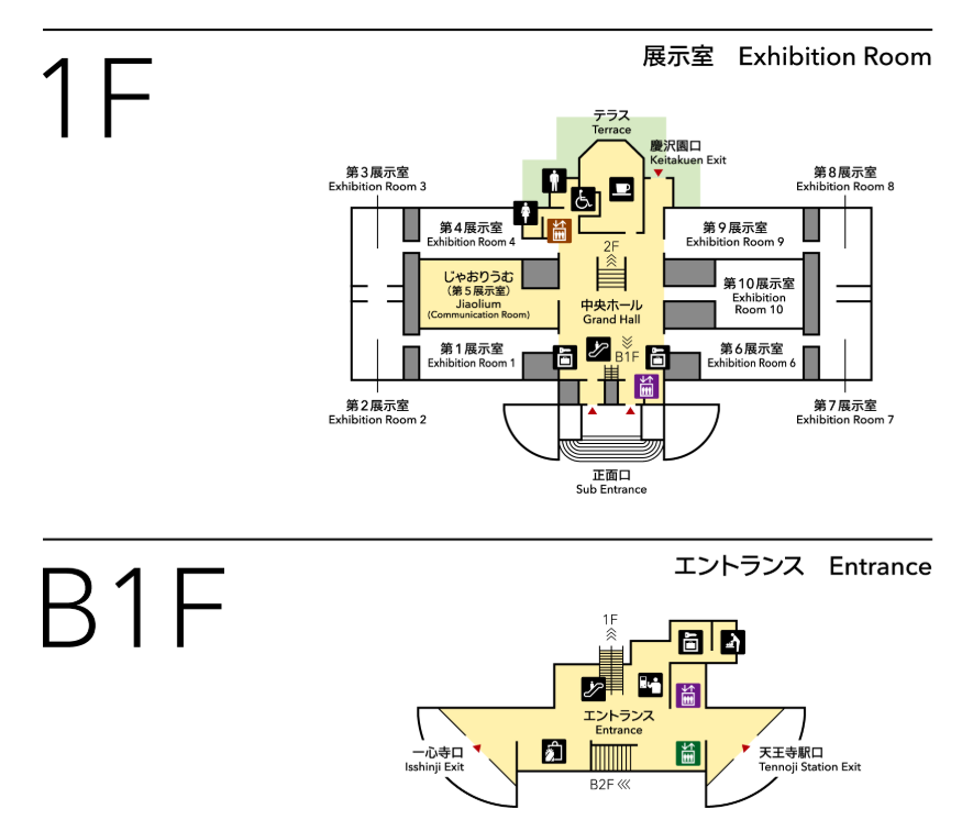 エントランス付近として地下1階と1階のフロアは次のような地図になっています。