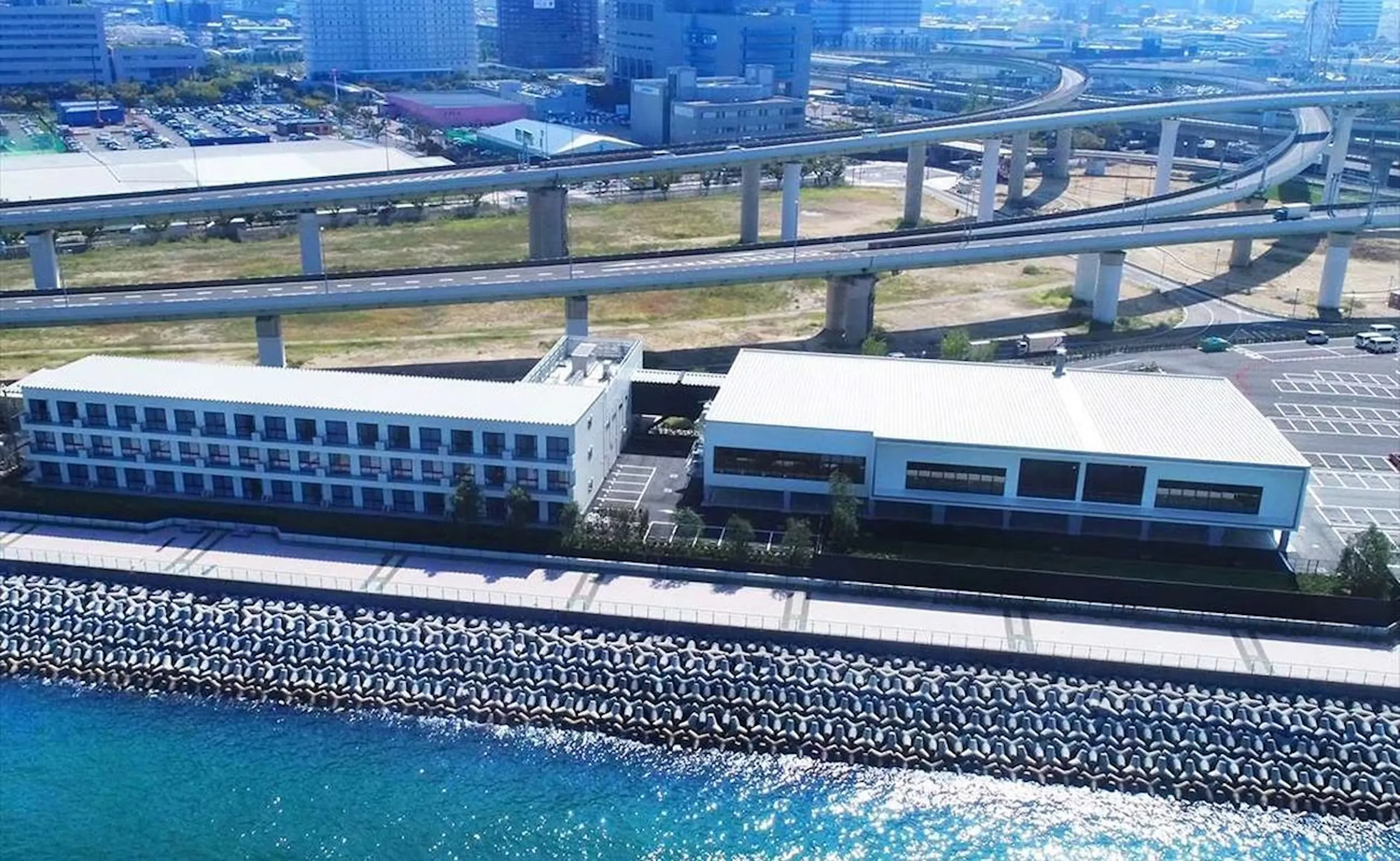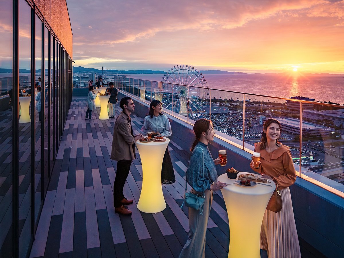 💡大阪湾を一望できるルーフトップバーが22階にあります、また24Hコンビニも併設。