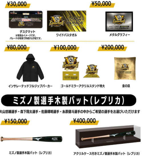 | ¥150,000 | ミズノ製 選手木製バット(レプリカ) | 大山悠輔/森下翔太/佐藤輝明/糸原健斗 | 記載なし | 2026年02月 | 支援時に選手選択 |
