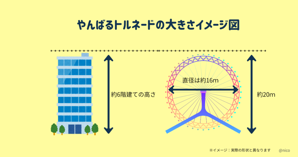 やんばるトルネードは、ライド直径が約16メートル、最大高度は約20メートルとされています。