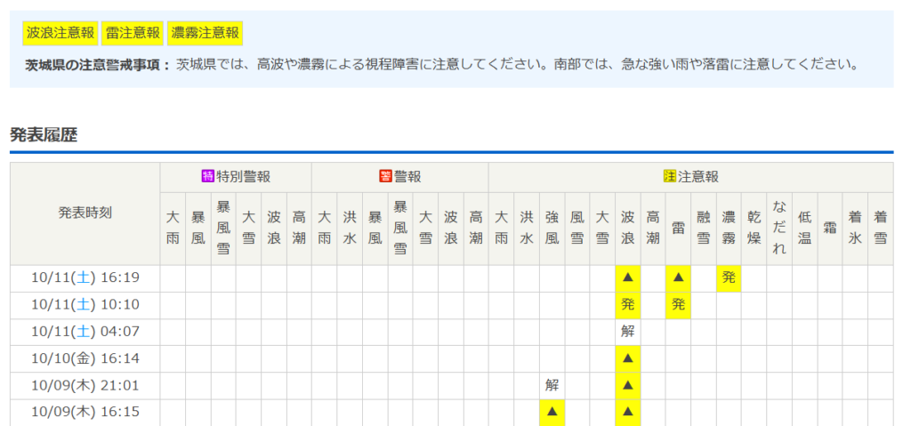 10月11日の花火大会開催が順延となって理由に「悪天候のため」とありました。11日には実際、『雷・波浪・濃霧』と3つの注意報が発令されていました!