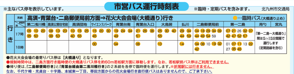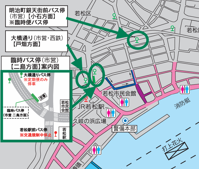 • 花火終了後はJR若松駅・臨時バス停・若戸渡船付近が非常に混雑➡必ず係員の誘導や案内に従って整列・移動することをおすすめします!