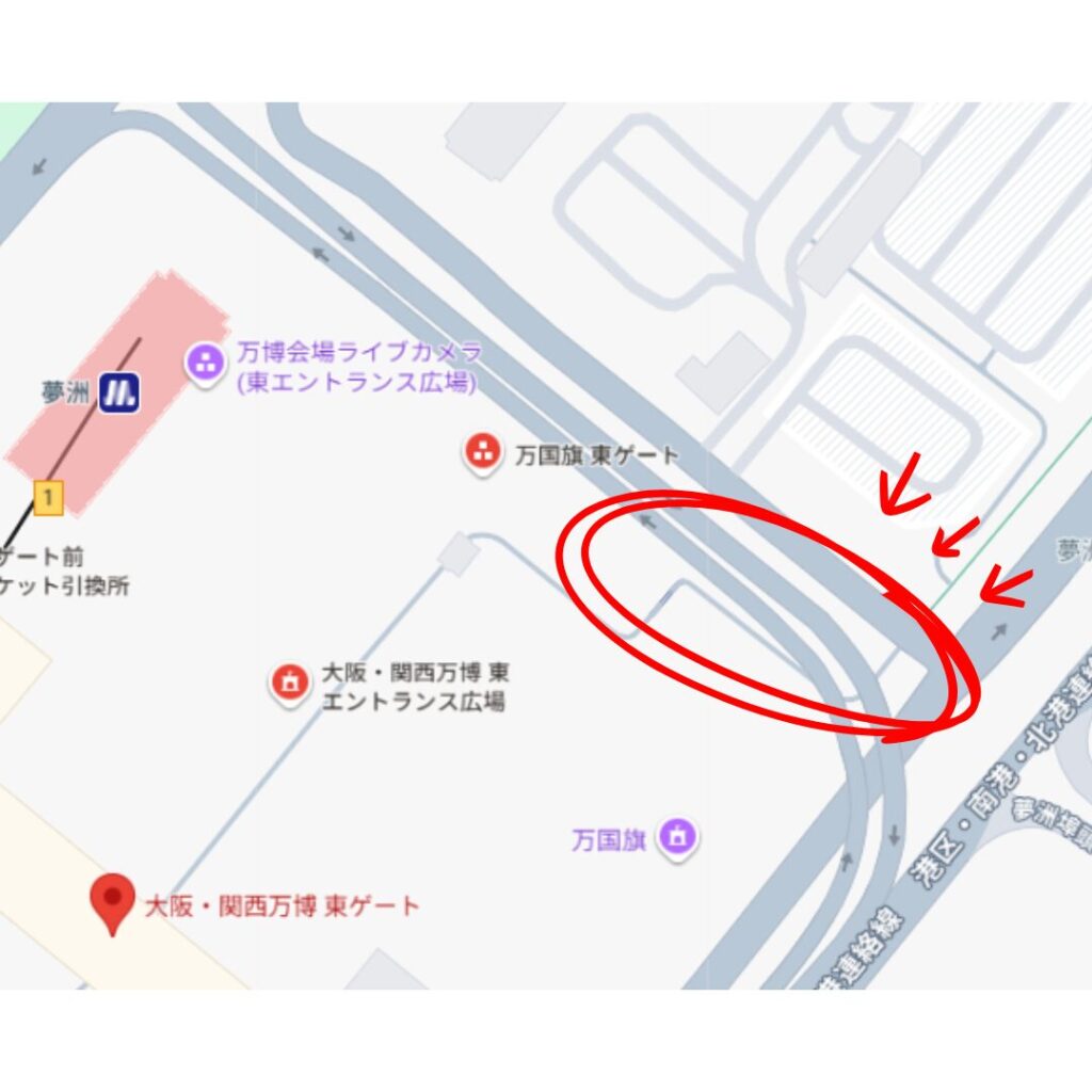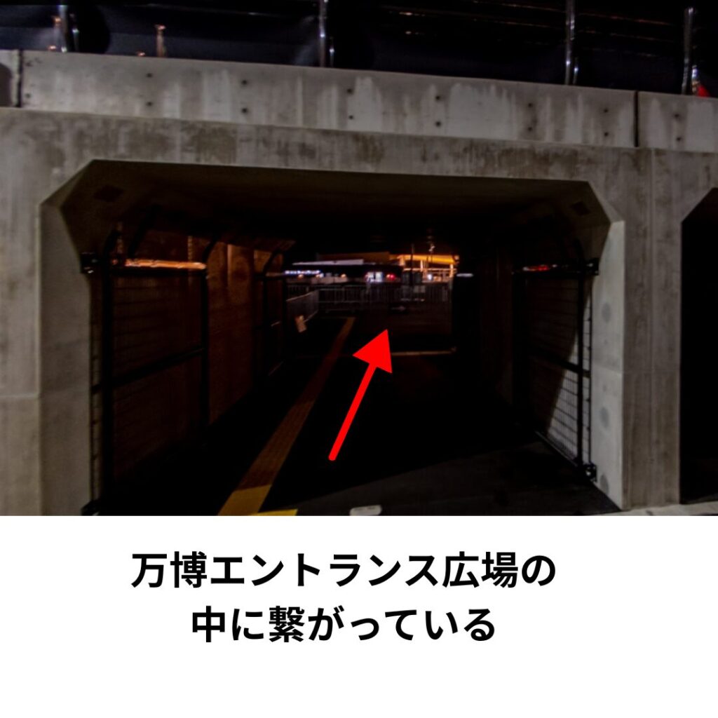 ここから徒歩で入場できるルートがあって、なんと警備員さんからの施錠が解かれて4時40分頃には万博会場の東ゲートに到達できる、とのこと!これは電車の最速の始発到着よりも約1時間早く、最速で並べるルートとして知られています。