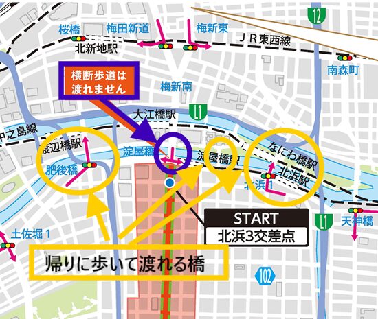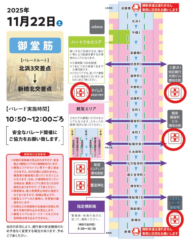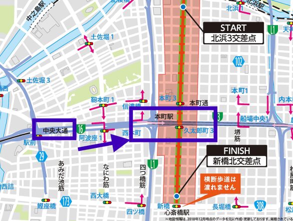 当日は御堂筋ルート内で細かくう回路の誘導があります。