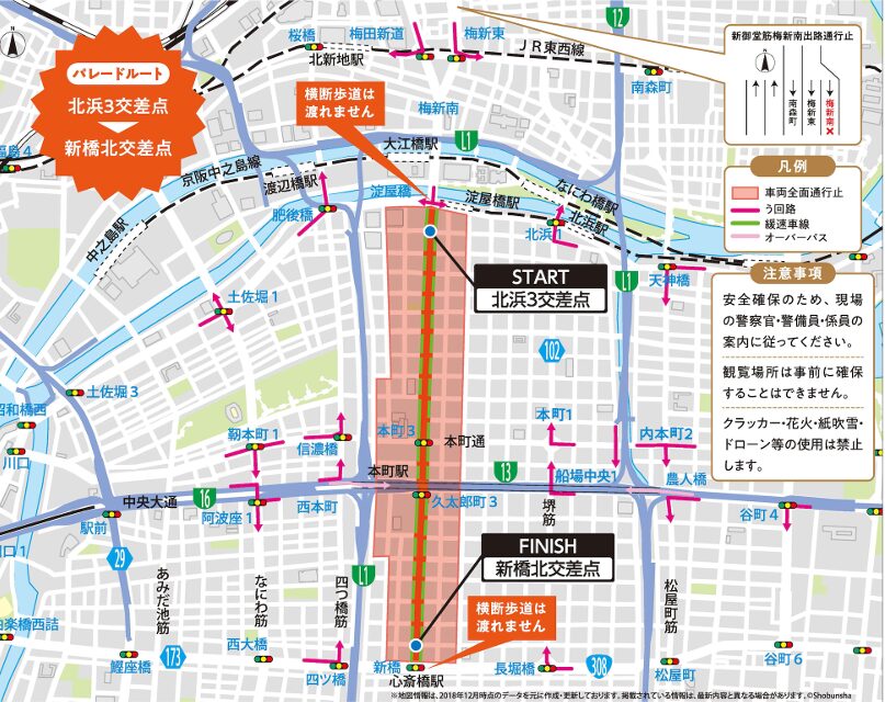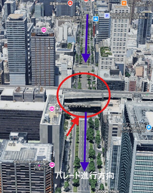 • 御堂筋線の3駅(淀屋橋・本町・心斎橋)はいずれもパレードルートの真下を走るため、